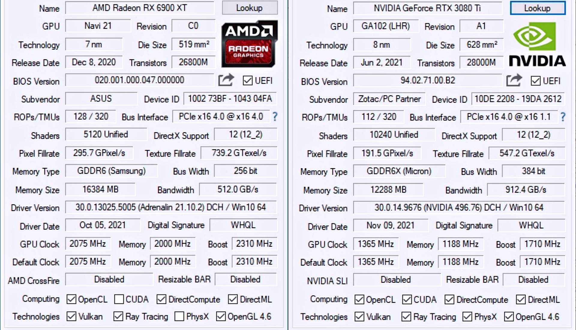 라데온 RX 6900XT의 경우 RTX 3080Ti 보다 530 MHz 더 빠른 GPU 클럭 속도, 111.7 Gpixel/s 더 높은 픽셀 속도, 812 MHz 더 빠른 메모리 클럭 속도, 50W 더 낮은 TDP, 4GB 더 많은 메모리, 580 MHz 더 빠른 GPU 터보 속도를 갖추고 있다.